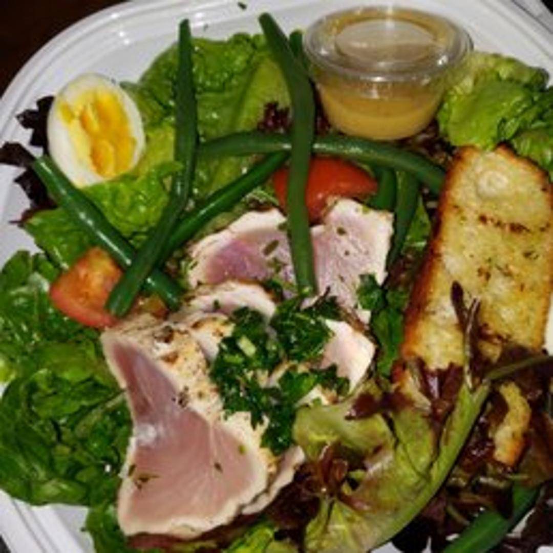 Sustainably sourced seared tuna, mixed greens, hard-boiled egg, potatoes, olives, green beans, tomatoes, and a lemon vinaigrette.
