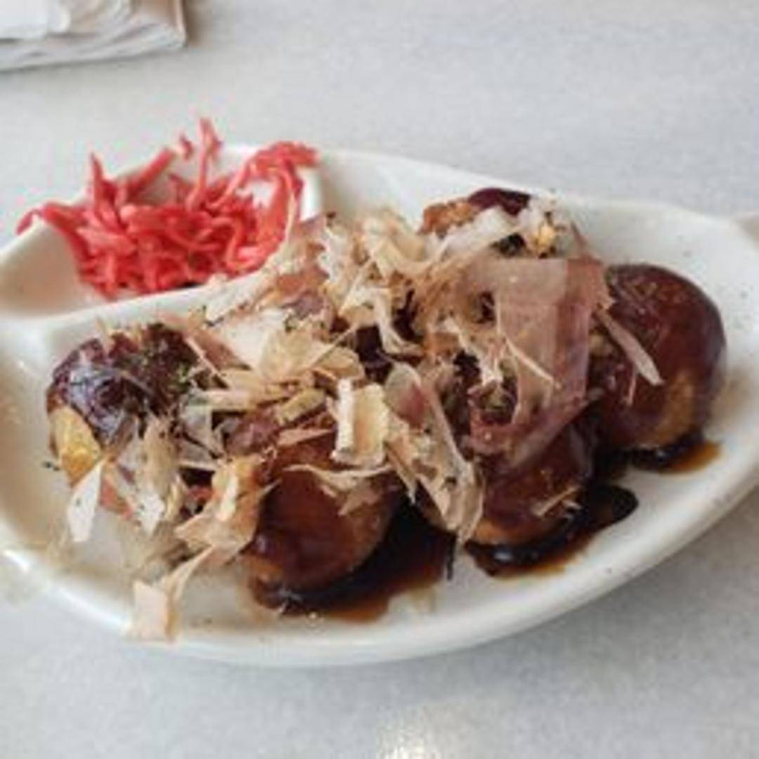 A popular Japanese street food, Takoyaki are savory, spherical wheat-flour dumplings filled with diced octopus (tako), tempura scraps (tenkasu), pickled ginger, and green onion. Cooked in a special molded pan, they are typically brushed with takoyaki sauce, drizzled with Japanese mayonnaise, and topped with katsuobushi (bonito flakes) and aonori (dried green seaweed).