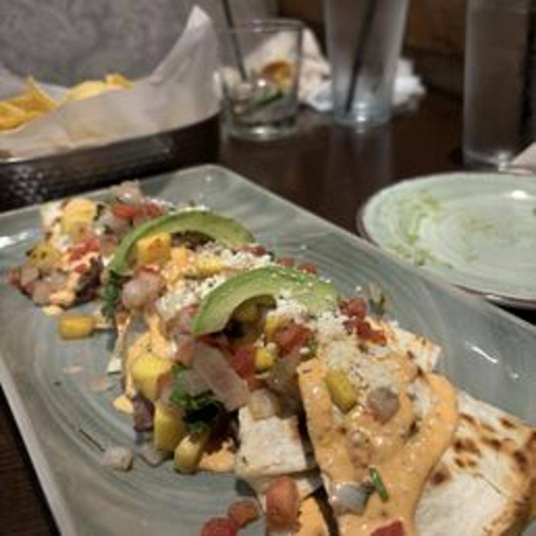 A large flour tortilla filled with melted Monterey Jack cheese, grilled chicken, and sweet mango chunks. Served with guacamole and sour cream.