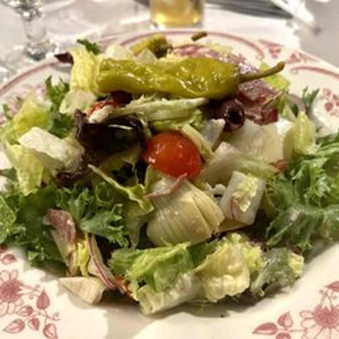 A vibrant Italian-style salad featuring mixed greens, cured Italian meats (such as salami and prosciutto), provolone cheese, marinated vegetables (olives, artichoke hearts, roasted peppers), and a tangy balsamic vinaigrette.