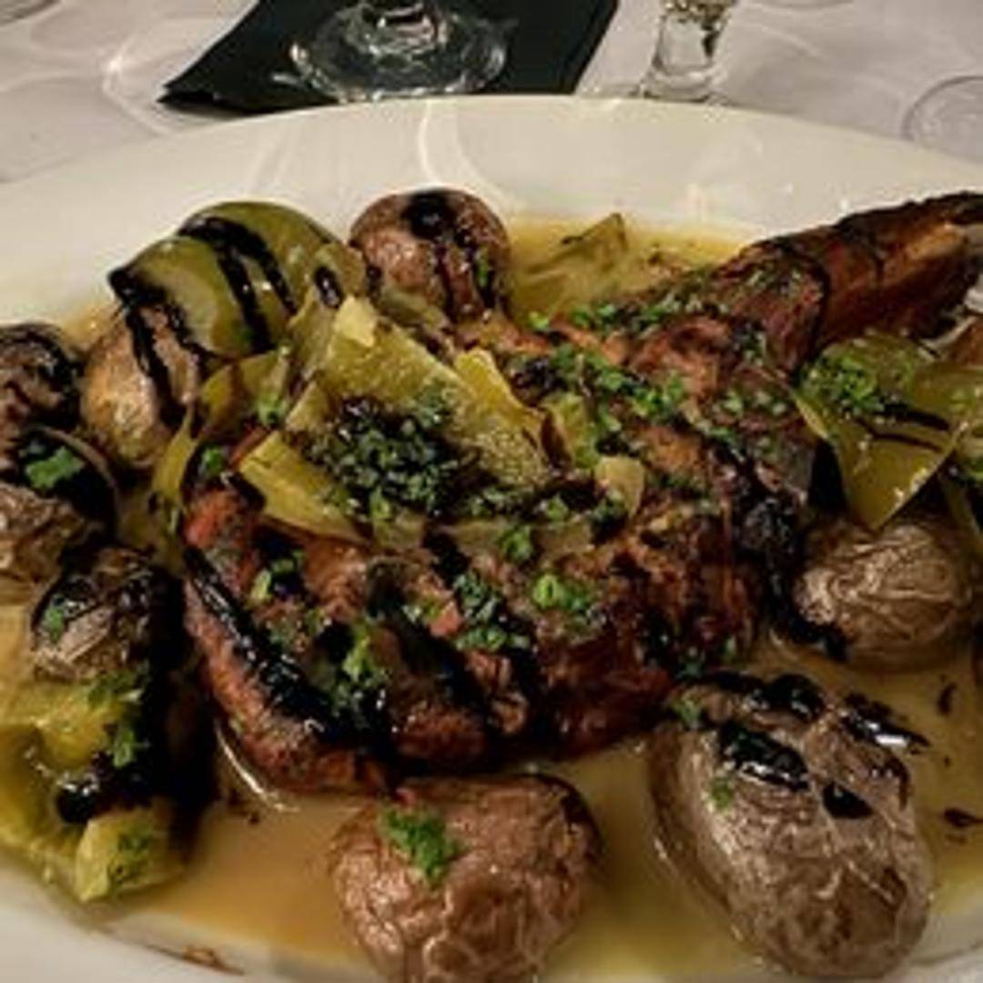 A thick-cut, bone-in pork chop, expertly seasoned and grilled to perfection. Served with a side of roasted vegetables and your choice of potato.