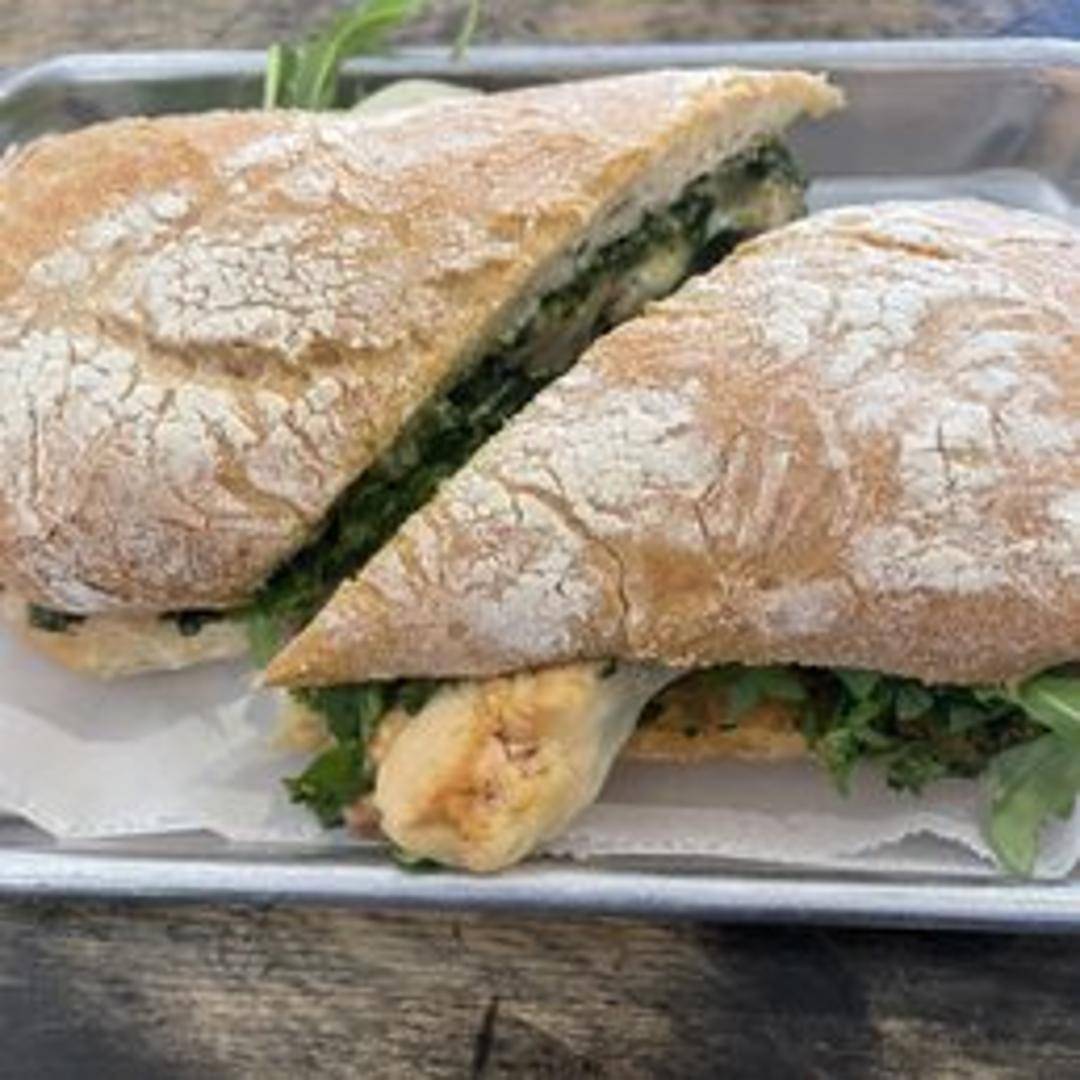 Grilled chicken breast, pesto sauce, provolone cheese, roasted red peppers, and lettuce on a ciabatta roll.