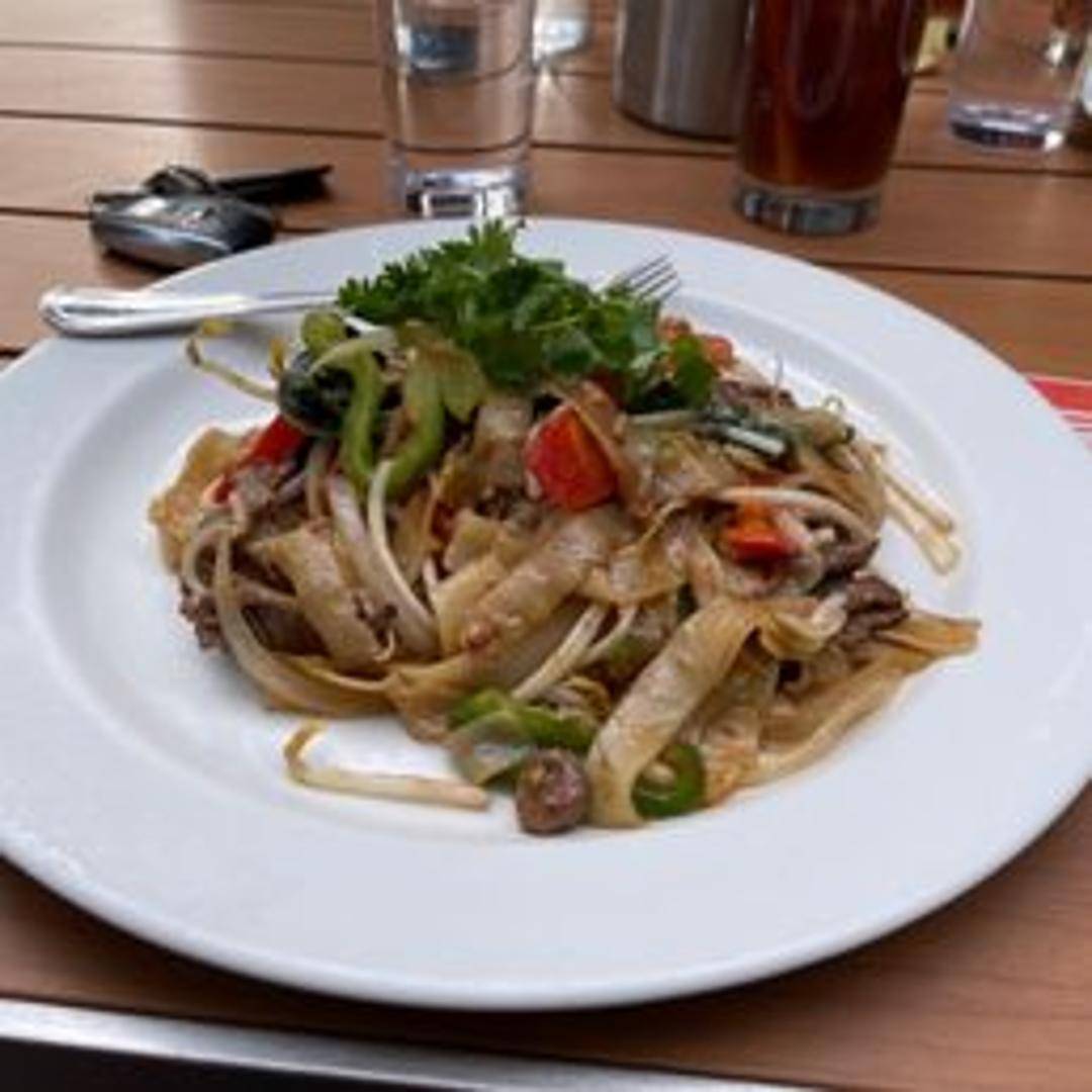 Wide rice noodles stir-fried with basil, tomatoes, bell peppers, onions, and chili in a spicy garlic sauce.