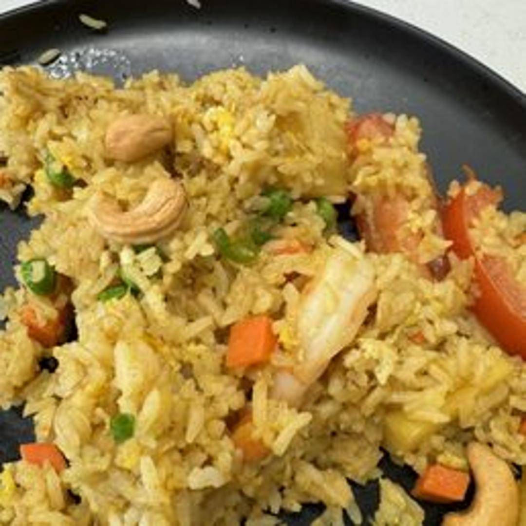 A delightful and flavorful Thai fried rice dish. Thai 303's Pineapple Fried Rice combines fluffy jasmine rice with pineapple chunks, cashews, raisins, onions, carrots, peas, and a savory blend of soy sauce, curry powder, and other Asian spices. We offer it with your choice of protein (chicken, pork, beef, tofu, or shrimp - specify when ordering). The dish is often served in a hollowed-out pineapple for an authentic and beautiful presentation.