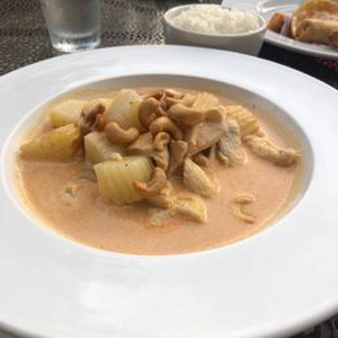 A rich, mild Thai curry with Indian and Persian influences. Made with coconut milk, potatoes, onions, peanuts, and a choice of protein (often chicken, beef, or tofu). Flavored with cardamom, cinnamon, cloves, and bay leaves.