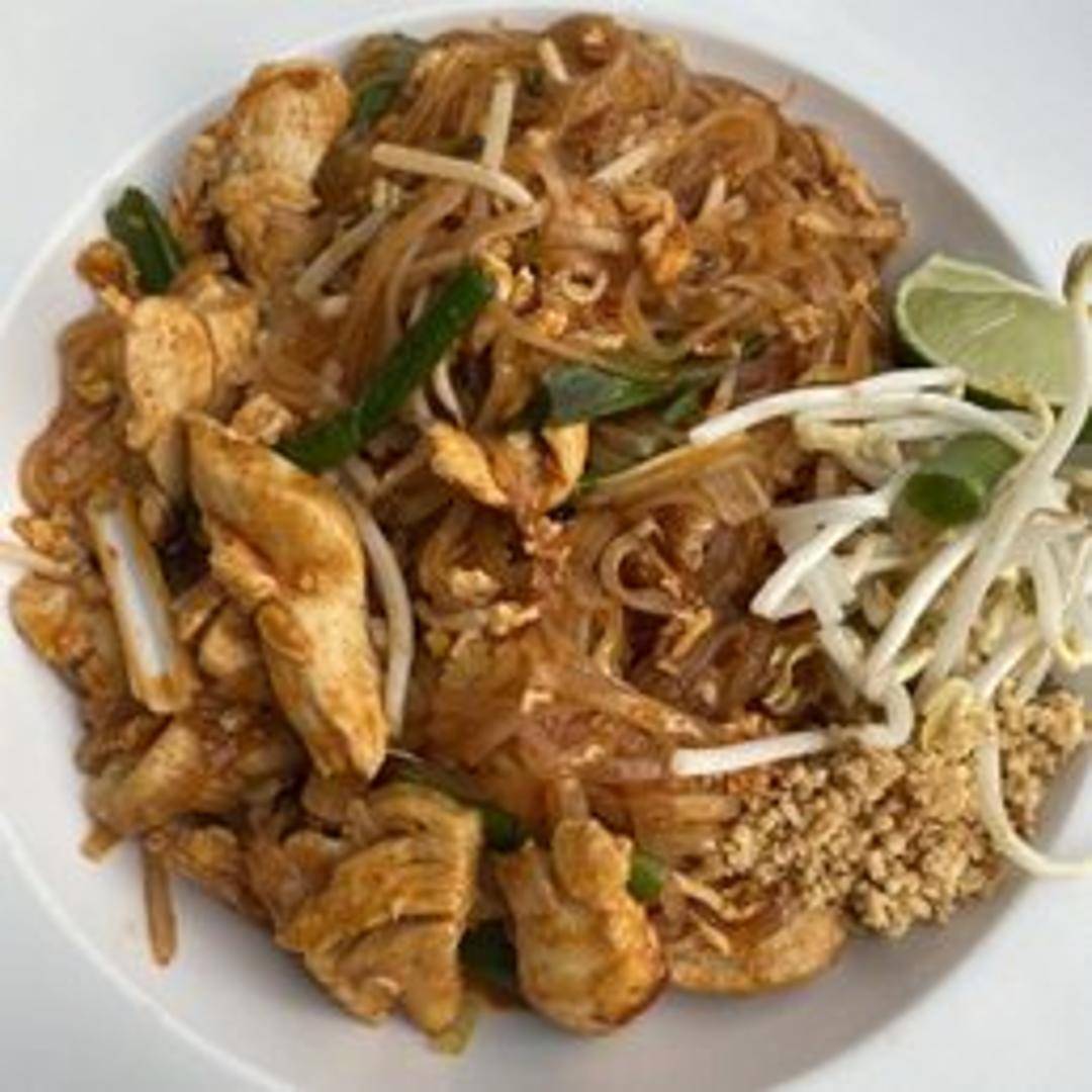 Rice noodles stir-fried with egg, bean sprouts, green onions, and peanuts in a sweet and savory tamarind sauce.