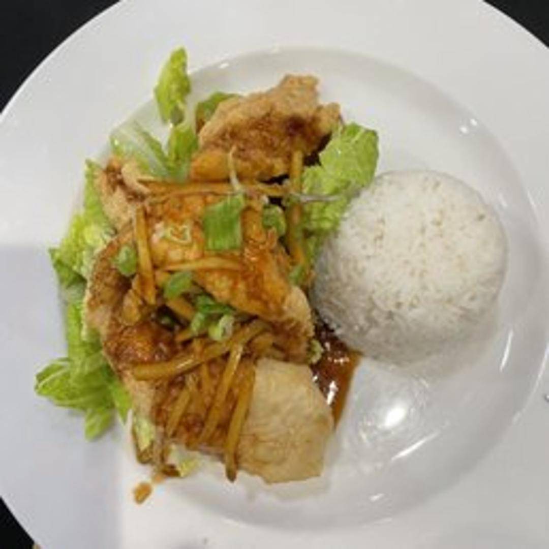 Golden-fried crispy catfish fillet served with a flavorful Thai sauce. Typically includes fresh herbs, vegetables, and a balance of sweet, sour, and spicy flavors. The sauce may include ingredients such as chili peppers, garlic, lime juice, fish sauce, and palm sugar. Garnished with cilantro and served with rice.