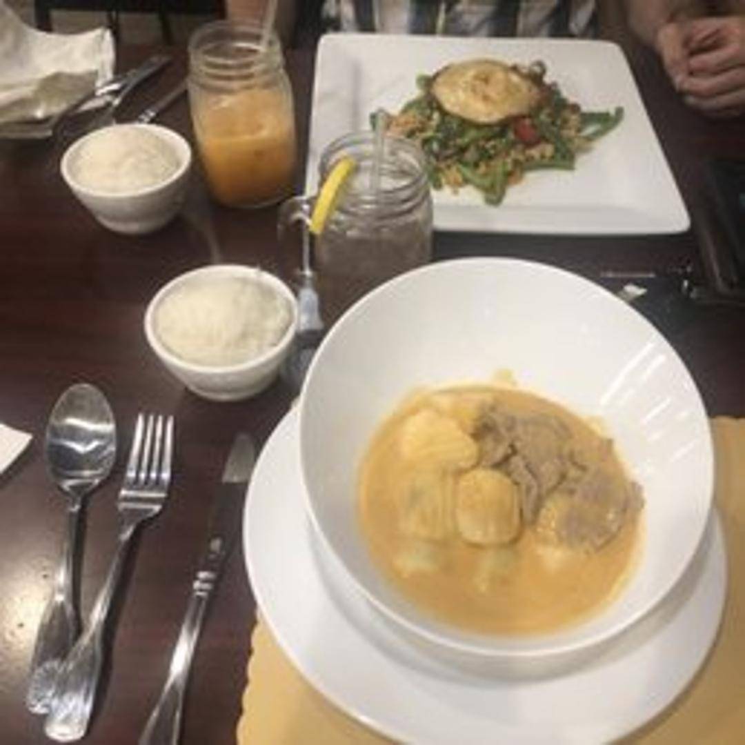 A rich and mild curry cooked in coconut milk with potatoes, onions, carrots, and peanuts. Served with white rice.