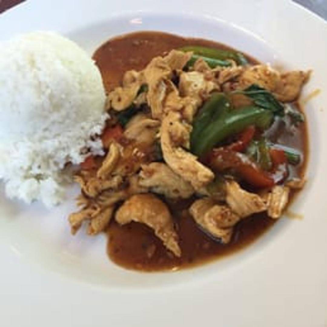 Stir-fried ground chicken with fresh basil leaves, onions, bell peppers, and chili peppers in a savory and spicy sauce. Served with steamed rice.