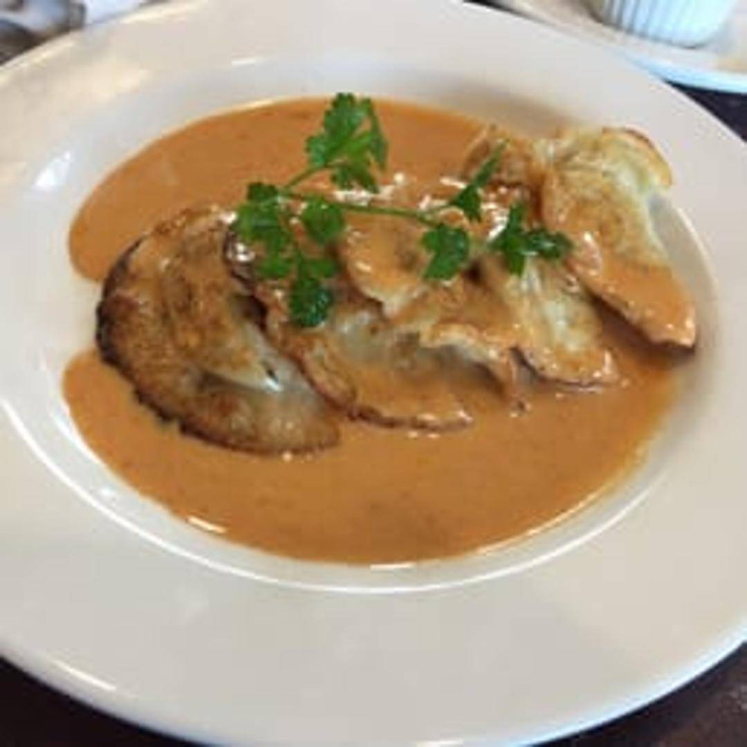 Pan-fried dumplings filled with a savory mixture. The filling is commonly made with ground pork, cabbage, and seasonings, encased in a thin dough wrapper. They are pan-fried to a golden-brown crisp on one side and steamed until tender on the other, often served with a dipping sauce.