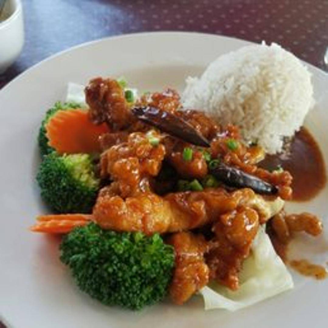 Deep-fried crispy chicken tossed in a sweet and spicy chili sauce. Garnished with sesame seeds and served with a side of steamed broccoli and white rice.