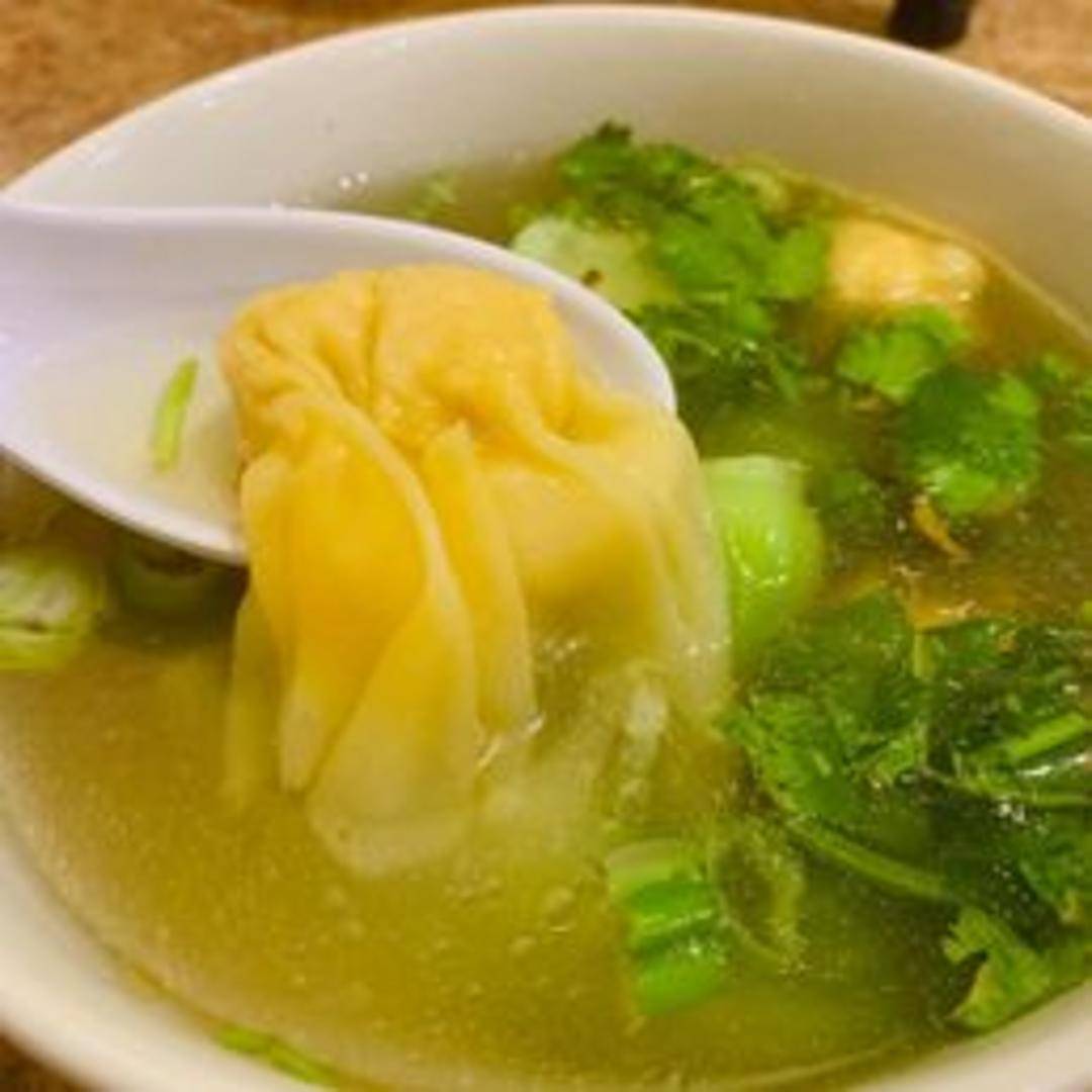 Clear broth soup with delicate wontons filled with seasoned ground pork and shrimp, garnished with scallions and cilantro.