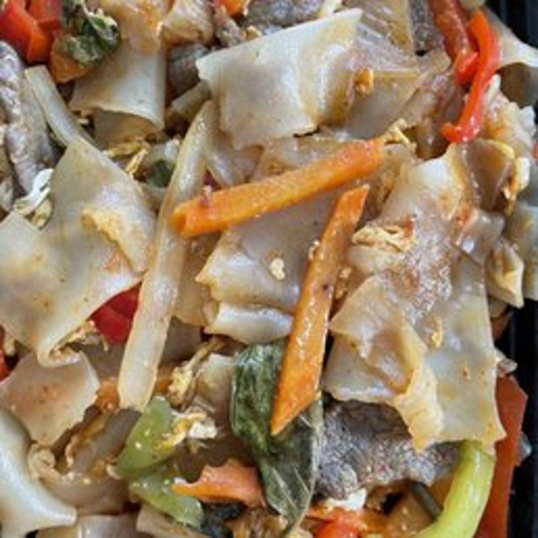Wide rice noodles stir-fried with Chinese broccoli, egg, and a savory sweet soy sauce.