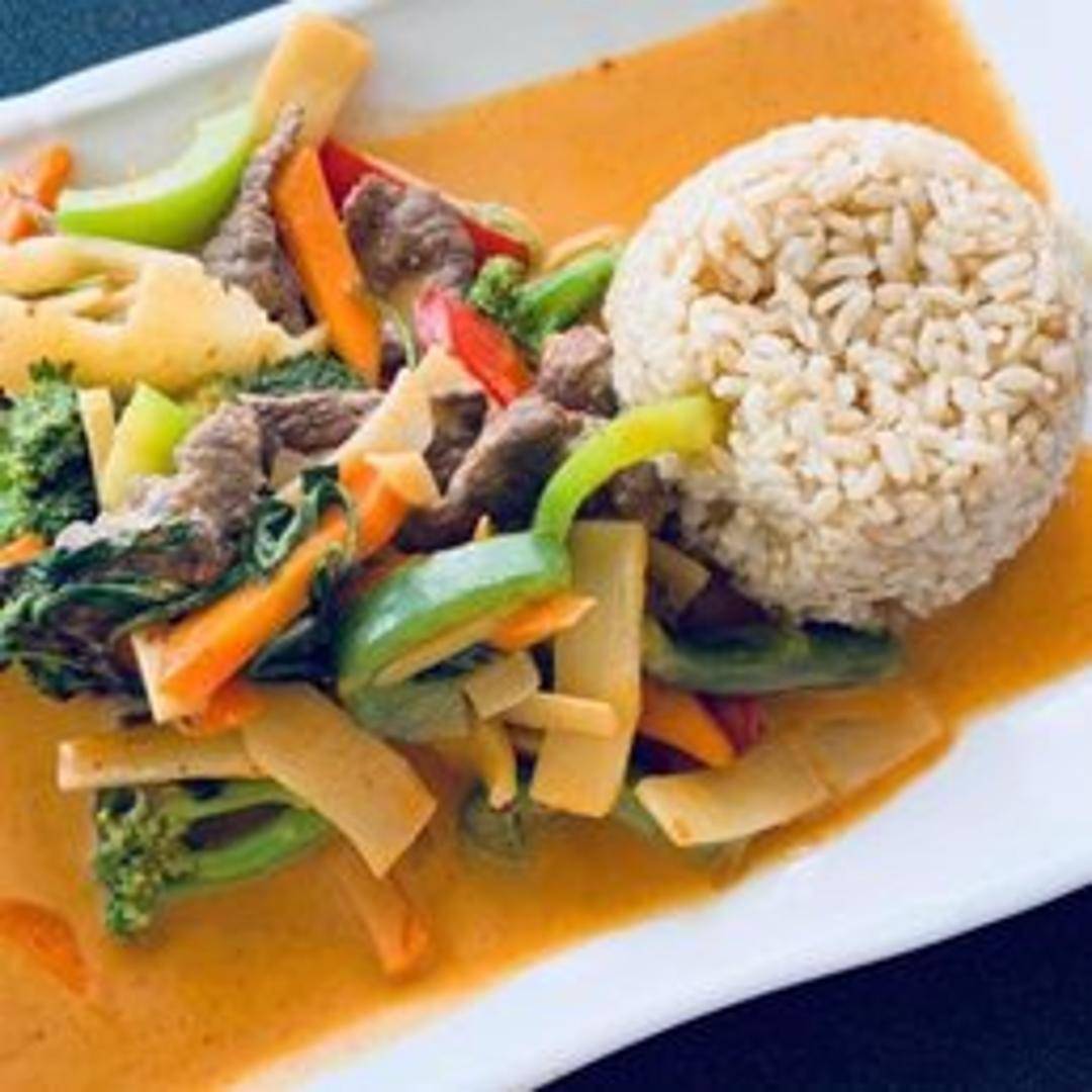 A flavorful and aromatic red curry cooked in coconut milk with bamboo shoots, bell peppers, and basil leaves. Choice of protein available.