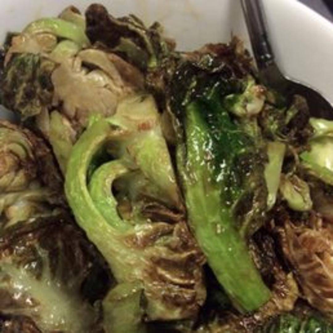 Pan-seared brussels sprouts tossed with garlic, soy sauce, and a touch of chili for a savory and slightly spicy flavor.
