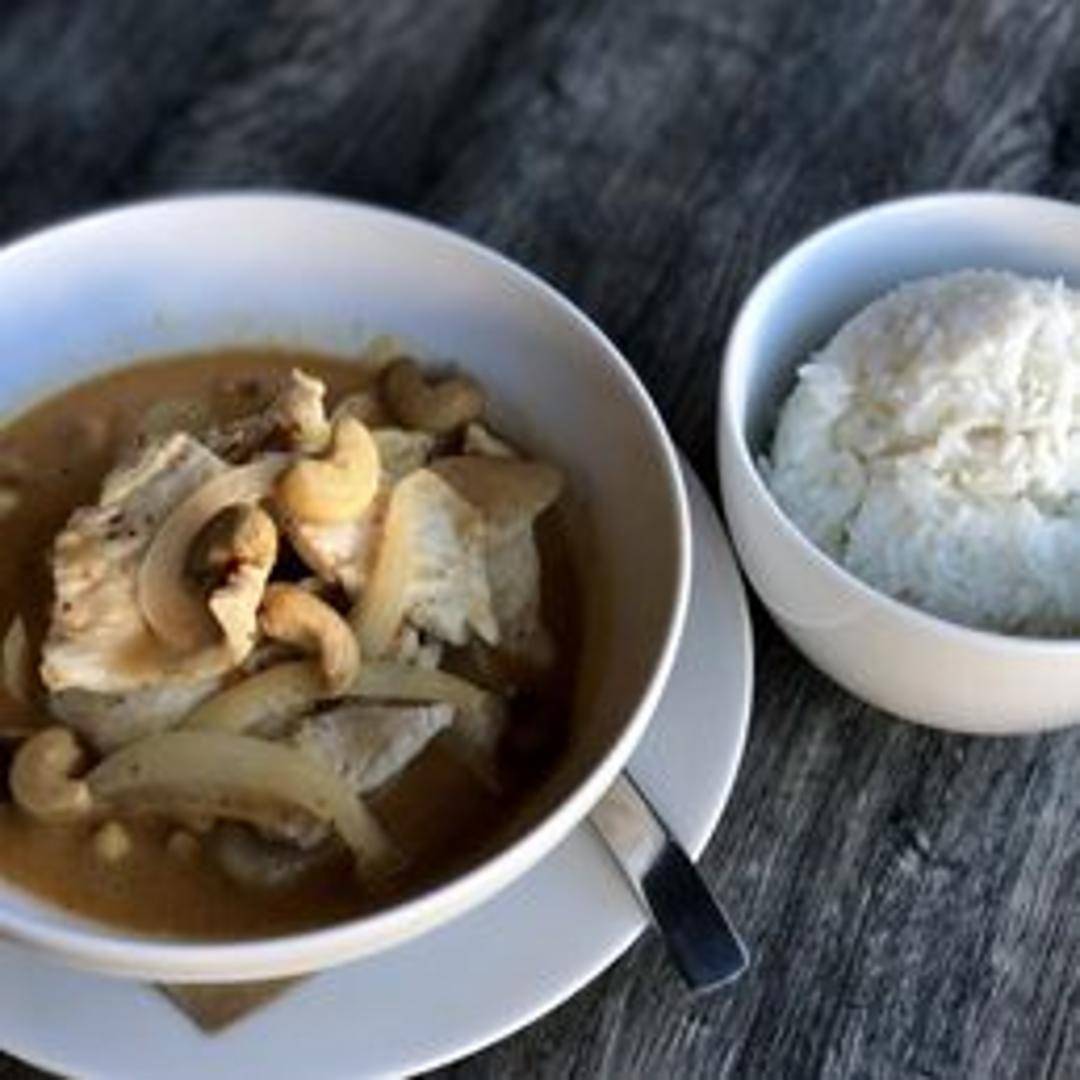 Indulge in our Massaman Curry, a beloved Thai dish known for its rich, mild, and subtly sweet profile. This hearty curry features tender potatoes, roasted peanuts, and onions, simmered in a luxurious coconut milk broth infused with a complex blend of aromatic spices like cardamom, cinnamon, and star anise. A truly comforting and flavorful experience.