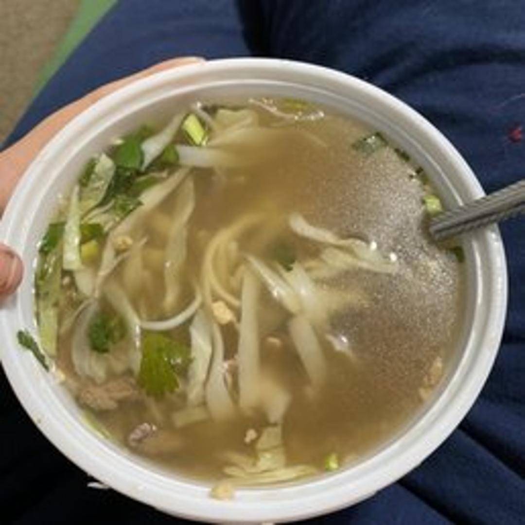 A flavorful Thai soup featuring tender sliced beef, rice noodles, bean sprouts, Chinese broccoli, and cilantro in a rich and aromatic broth. Often garnished with fried garlic and chili flakes.