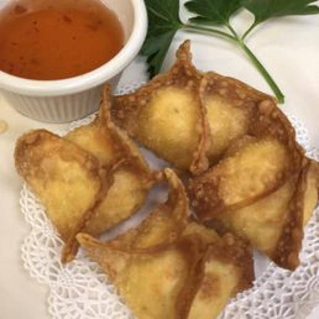 Crispy wonton wrappers filled with a creamy mixture of crab meat and cream cheese, served with a sweet and sour dipping sauce.