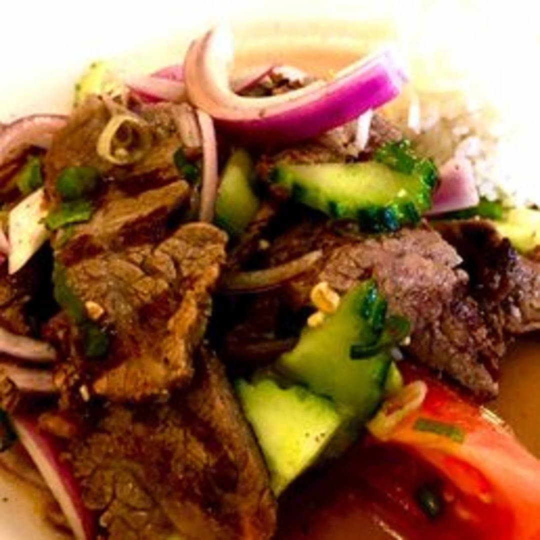 Experience the vibrant flavors of Thailand with our Spicy Beef Salad. This refreshing and invigorating dish features tender, thinly sliced grilled beef, expertly tossed with a colorful medley of crisp red onions, fresh cilantro, fragrant mint leaves, and green onions. It's all brought together with a bold and zesty lime dressing, perfectly balanced with savory fish sauce and a touch of roasted ground rice, which adds a delightful nutty aroma and subtle texture. A harmonious blend of spicy, tangy, and savory notes, this salad offers a satisfying kick and a light, flavorful experience.