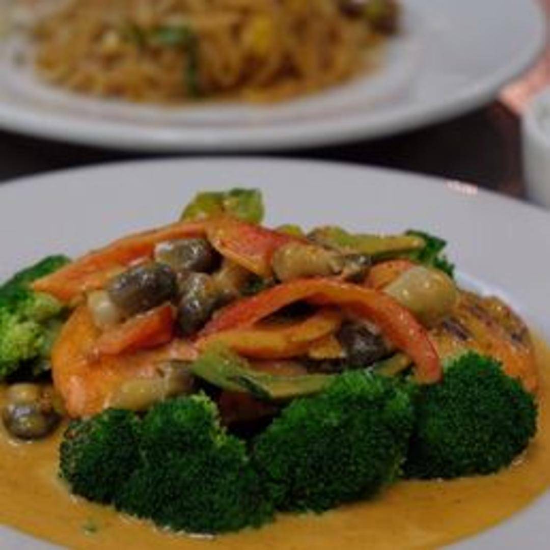 Experience the vibrant flavors of Thailand with our Basil Leaf Chicken, a beloved dish featuring tender chicken stir-fried with fragrant holy basil leaves, fresh chili, garlic, and crisp green beans. This savory and aromatic creation delivers a delightful balance of spicy, sweet, and umami notes, perfect for an authentic taste adventure.