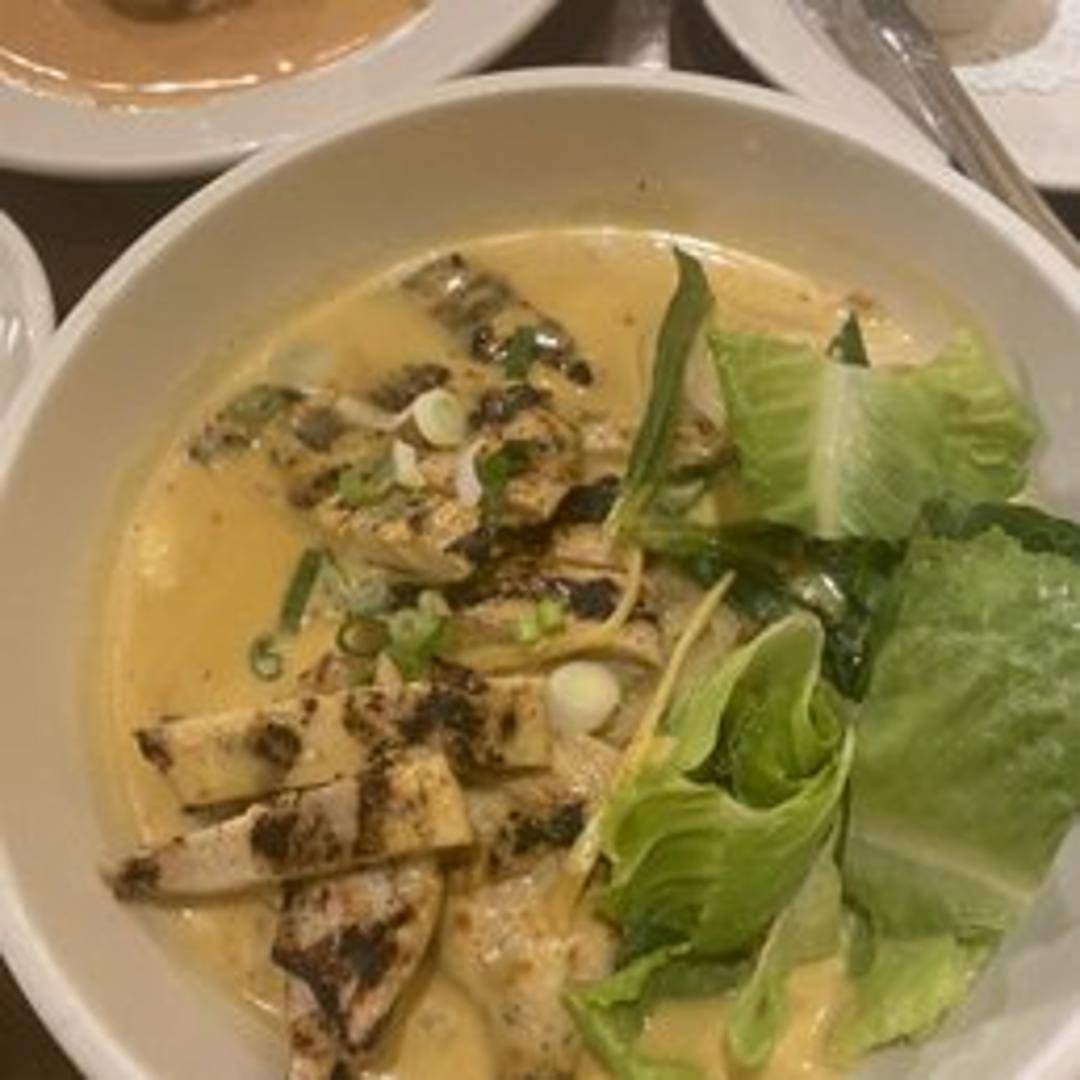 Savor a comforting and hearty Chicken Noodle Bowl, a flavorful Thai-style soup that warms you from the inside out. This generous bowl features tender slices of chicken, perfectly cooked rice noodles, and a medley of fresh vegetables like bean sprouts and scallions, all swimming in a rich, aromatic broth. A truly satisfying and nourishing meal.