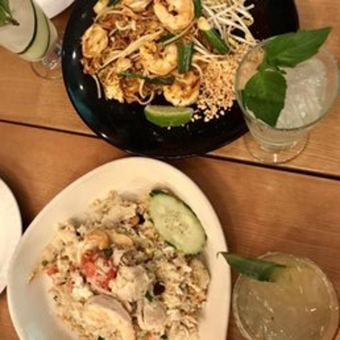 A colorful and aromatic Thai-style fried rice dish, often presented in a hollowed-out pineapple shell. It features jasmine rice stir-fried with sweet chunks of fresh pineapple, crunchy cashews, plump raisins, bell peppers, and your choice of protein, all lightly seasoned with curry powder for a golden hue and delightful sweet-savory flavor.