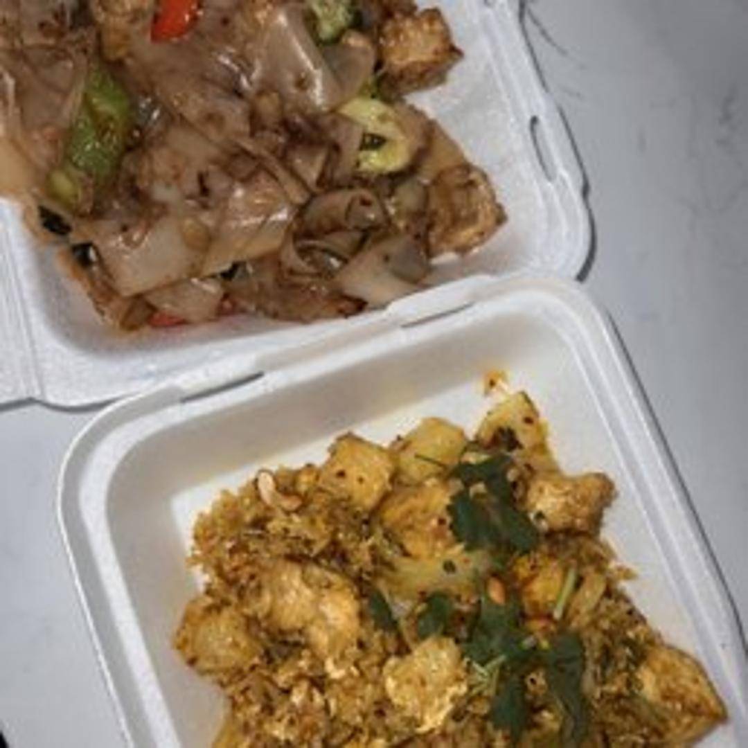 Wide rice noodles stir-fried with vegetables, basil, chili peppers, and your choice of protein in a spicy sauce.
