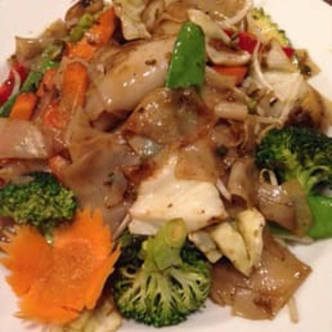 Wide rice noodles stir-fried with eggs, Chinese broccoli, and your choice of protein in a sweet soy sauce.