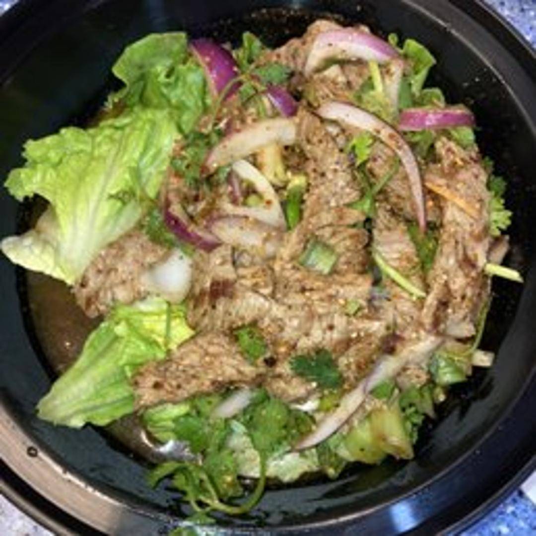 A vibrant and refreshing Thai salad featuring tender slices of grilled beef tossed with crisp red onions, fresh cilantro, invigorating mint leaves, and juicy tomatoes. All ingredients are harmoniously mixed in a zesty lime dressing, balanced with the savory depth of fish sauce and a fiery kick from fresh chilies, creating a perfect blend of spicy, sour, and savory flavors.