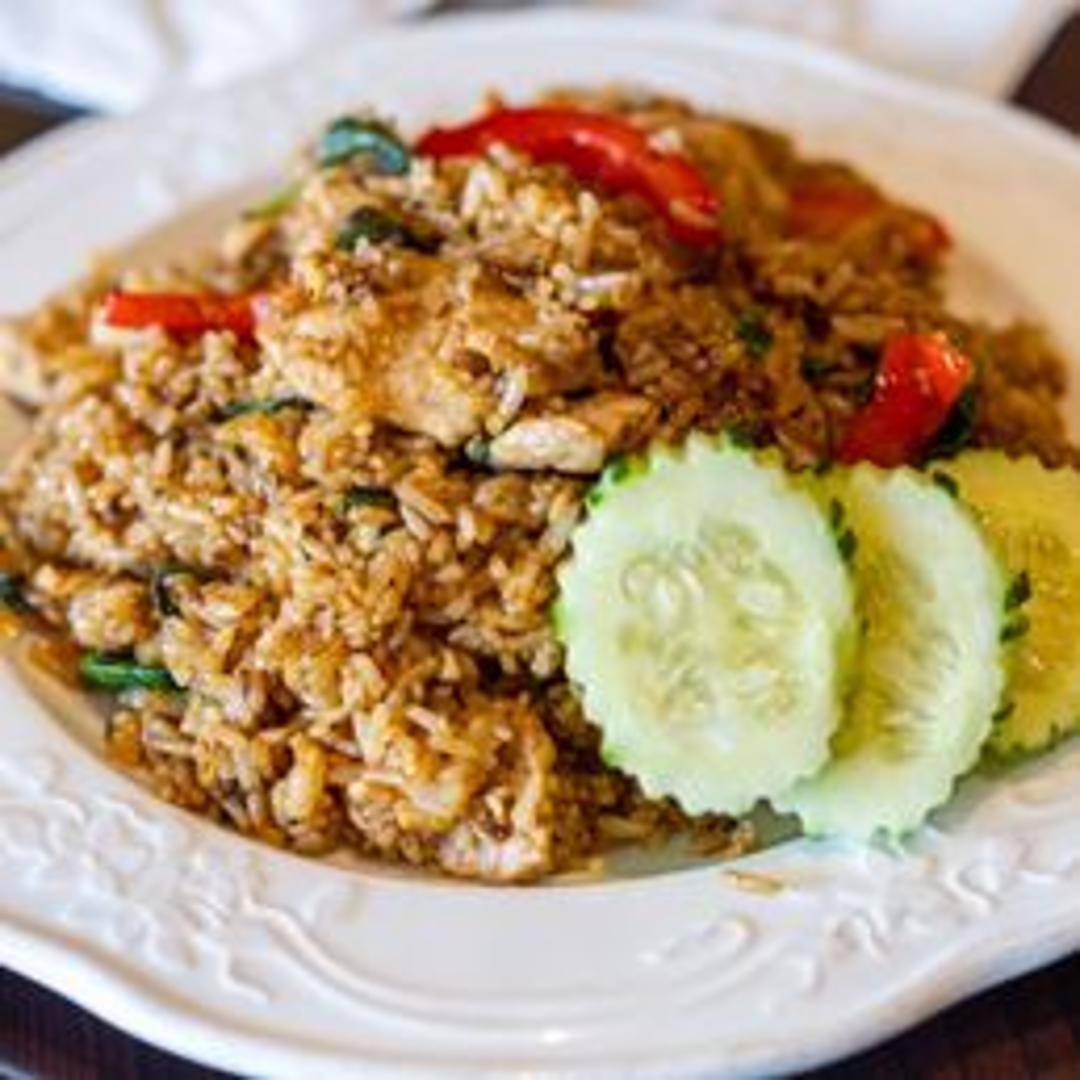 Aromatic jasmine rice stir-fried with fresh holy basil leaves, minced garlic, fiery chilies, onions, and bell peppers, all tossed in a savory house sauce. This popular dish is known for its fragrant aroma and spicy kick, offering a satisfying and flavorful meal.