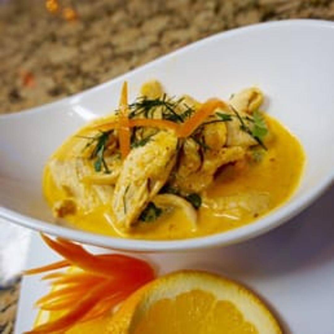 A rich and creamy Thai red curry with coconut milk, Panang curry paste, bell peppers, bamboo shoots, green beans, and your choice of protein. Garnished with fresh basil and served with steamed jasmine rice.