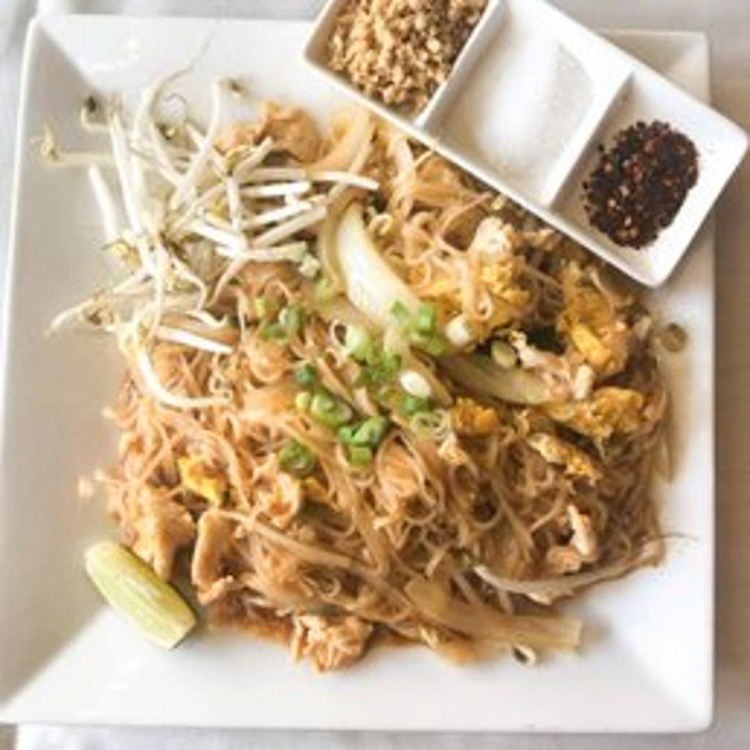 A classic Thai noodle dish featuring stir-fried rice noodles with egg, bean sprouts, scallions, and your choice of protein (tofu, chicken, shrimp, or beef). Tossed in a tangy and savory Pad Thai sauce, topped with crushed peanuts and a lime wedge.