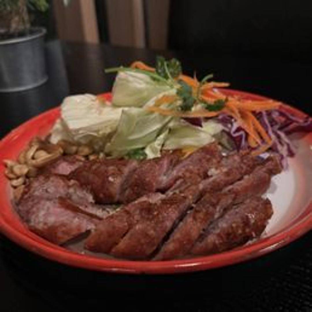 Fermented pork sausage, grilled and served with ginger, peanuts, and chili peppers.