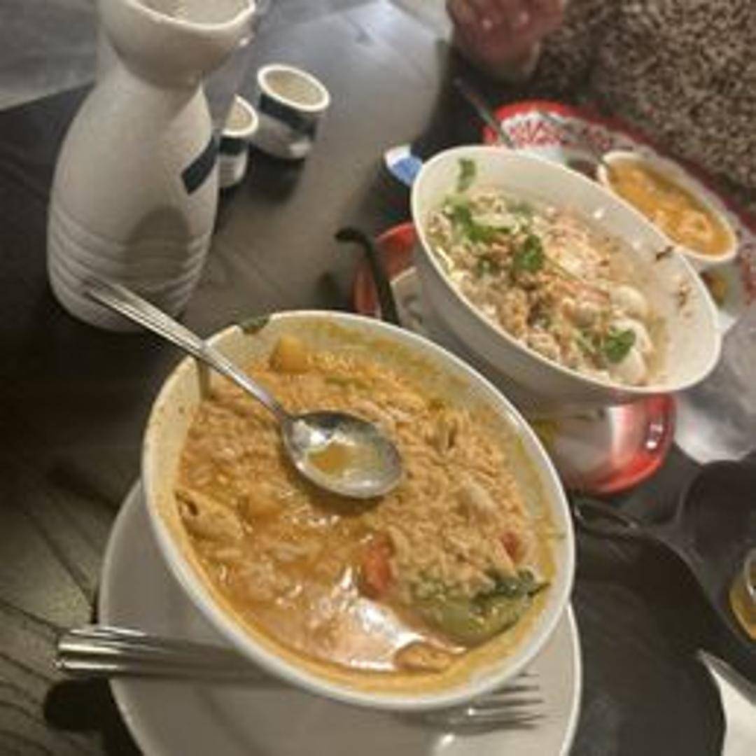 Spicy and sour noodle soup with shrimp, mushrooms, tomatoes, lemongrass, galangal, and kaffir lime leaves.