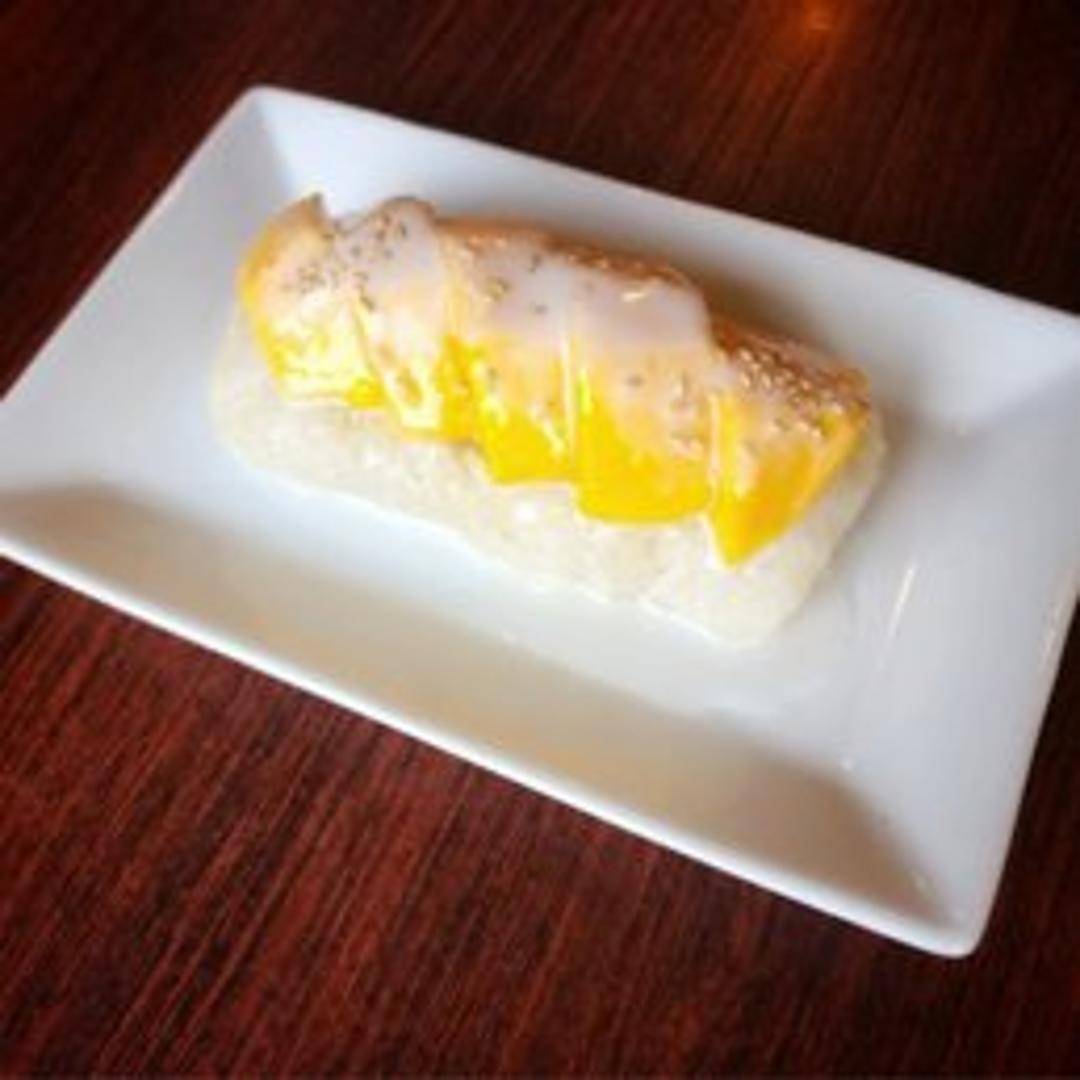 A beloved traditional Thai dessert featuring perfectly ripened, sweet mango slices served alongside warm, glistening sticky rice, all generously drizzled with a rich and creamy coconut milk sauce. Often garnished with a sprinkle of toasted sesame seeds for added texture and nutty flavor, this dish is a delightful sweet finish.