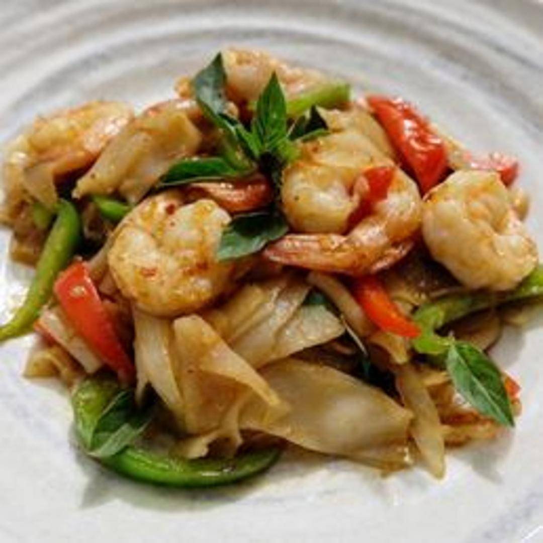 Wide rice noodles stir-fried with basil, onions, bell peppers, tomatoes, and chili peppers in a spicy and flavorful sauce. Served with your choice of protein.