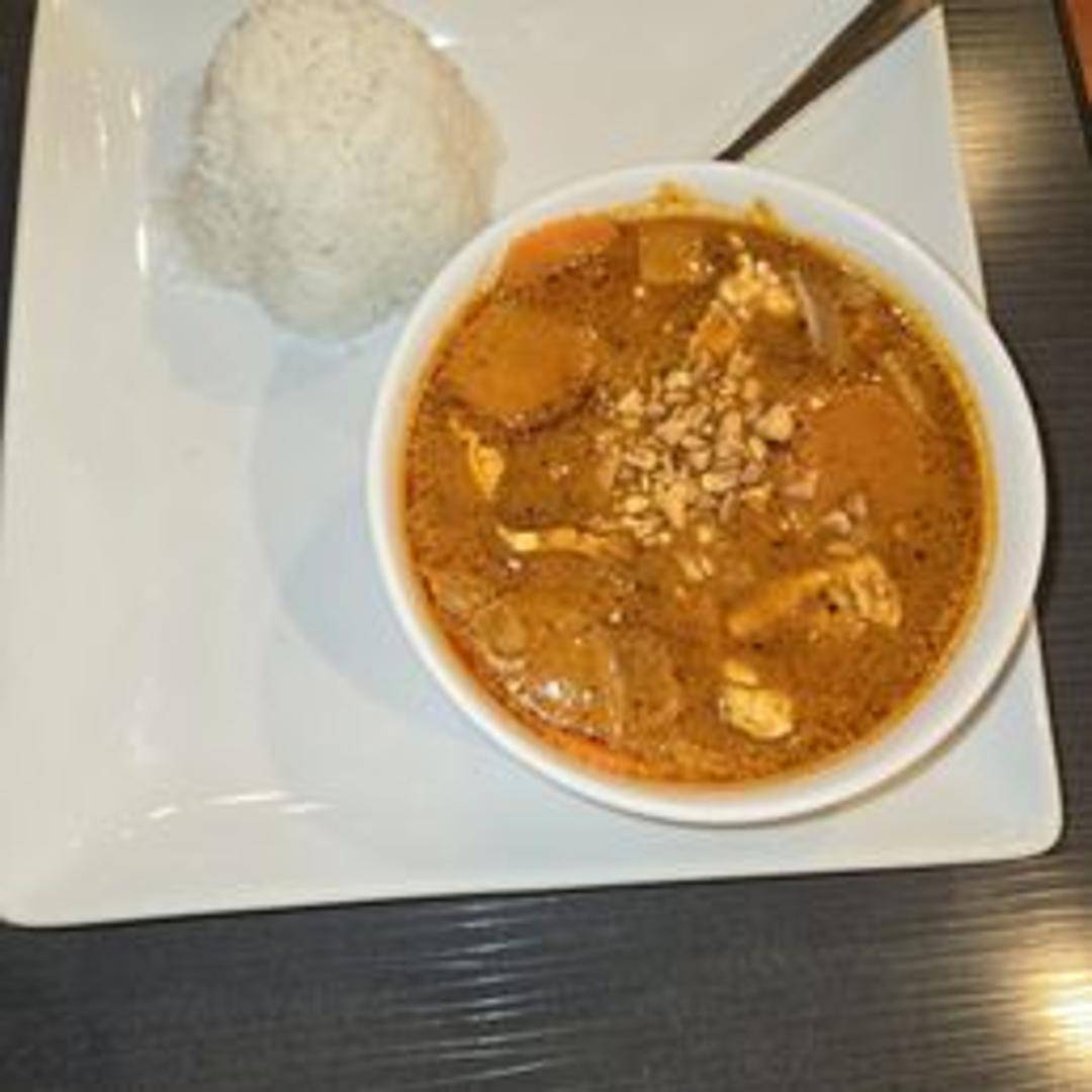 A mild and rich curry cooked in coconut milk with potatoes, onions, carrots, peanuts, and your choice of protein.
