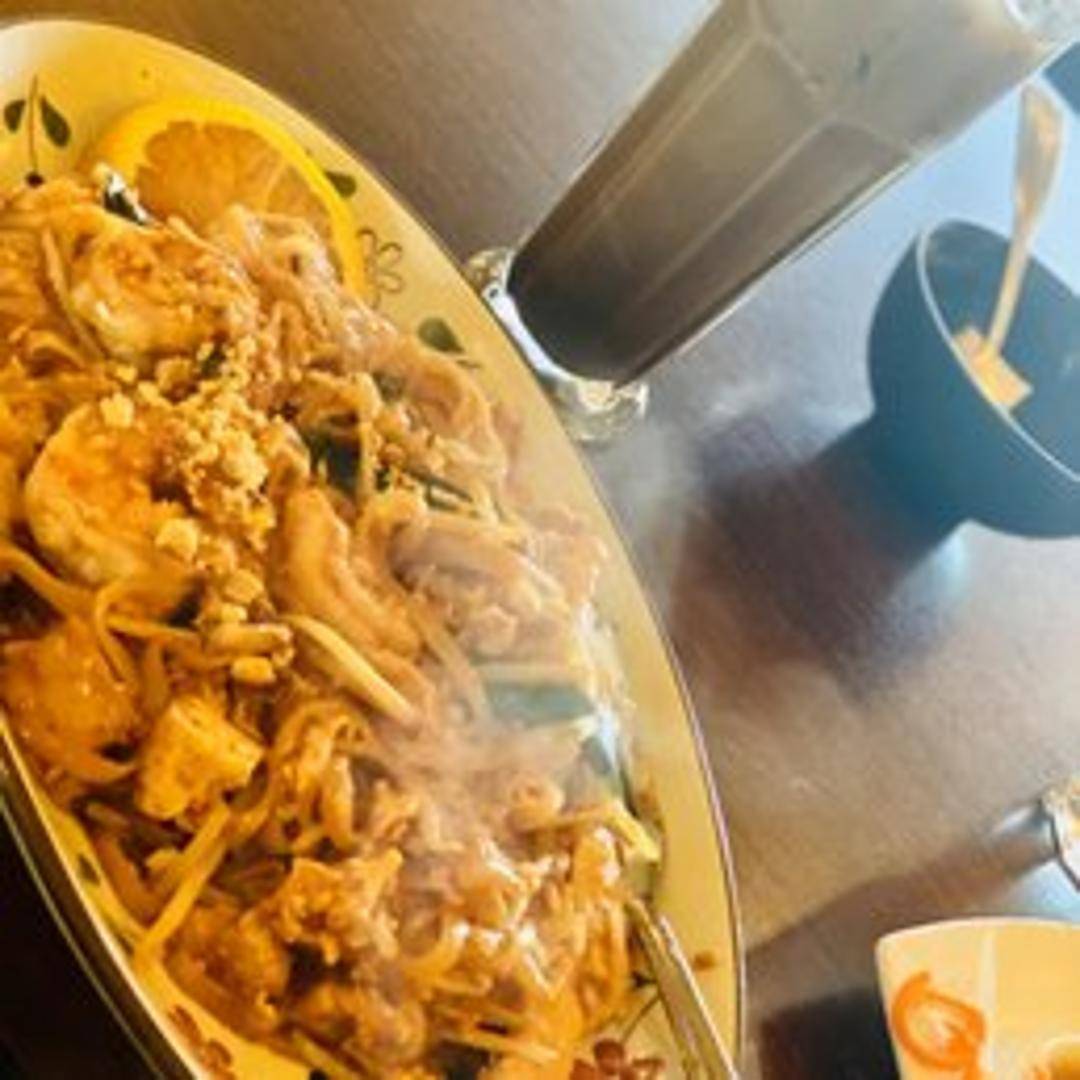 Thailand's most famous noodle dish. Stir-fried rice noodles with egg, bean sprouts, tofu, and your choice of protein (tofu, chicken, pork, beef, or shrimp) in a tangy tamarind sauce. Garnished with crushed peanuts, green onions, and a lime wedge.
