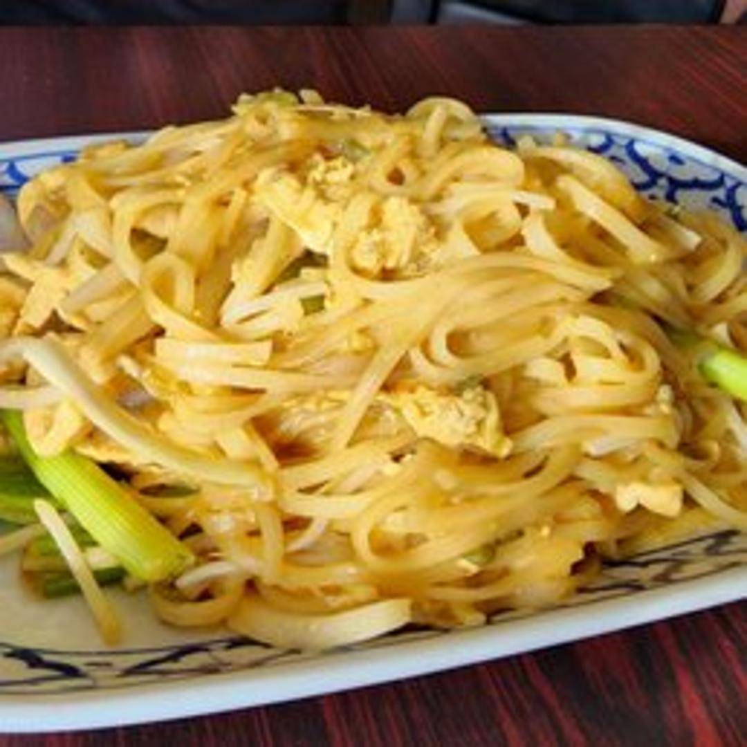 Thailand's most iconic noodle dish, featuring stir-fried thin rice noodles with scrambled egg, crisp bean sprouts, and green onions. Tossed in a savory-sweet tamarind sauce and garnished with crushed peanuts and a fresh lime wedge for a classic, balanced flavor.