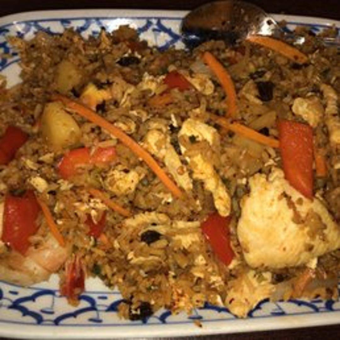 A delightful and aromatic blend of jasmine rice stir-fried with sweet pineapple chunks, crunchy cashews, plump raisins, crisp bell peppers, and fresh onions. Infused with a mild curry powder, this dish offers a harmonious balance of sweet, savory, and subtly spicy tropical flavors, often presented in a hollowed-out pineapple shell.