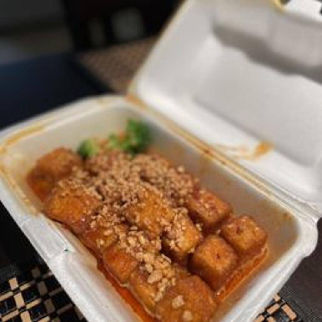 Lightly fried tofu topped with peanut sauce and steamed broccoli.
