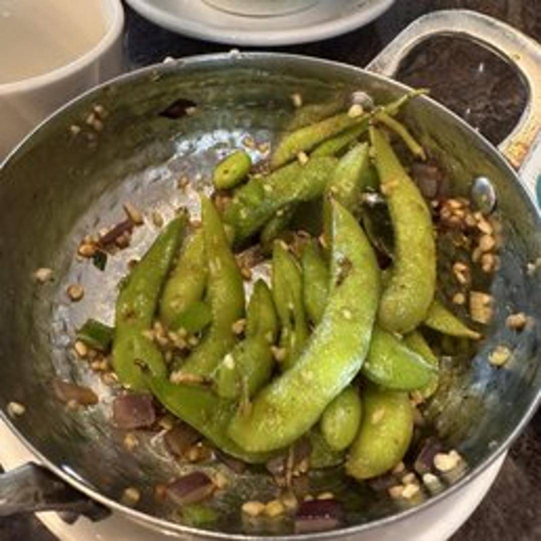 Steamed edamame pods tossed with fragrant garlic, a touch of soy sauce, and a hint of sesame oil. A flavorful and healthy appetizer.