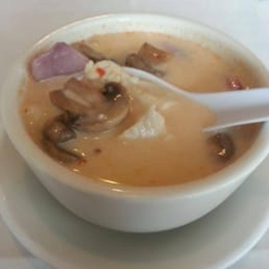 A fragrant and creamy Thai soup featuring tender chicken simmered in coconut milk with galangal, lemongrass, kaffir lime leaves, mushrooms, and chili. Finished with cilantro and a touch of lime juice for a balanced sweet, sour, and spicy flavor.