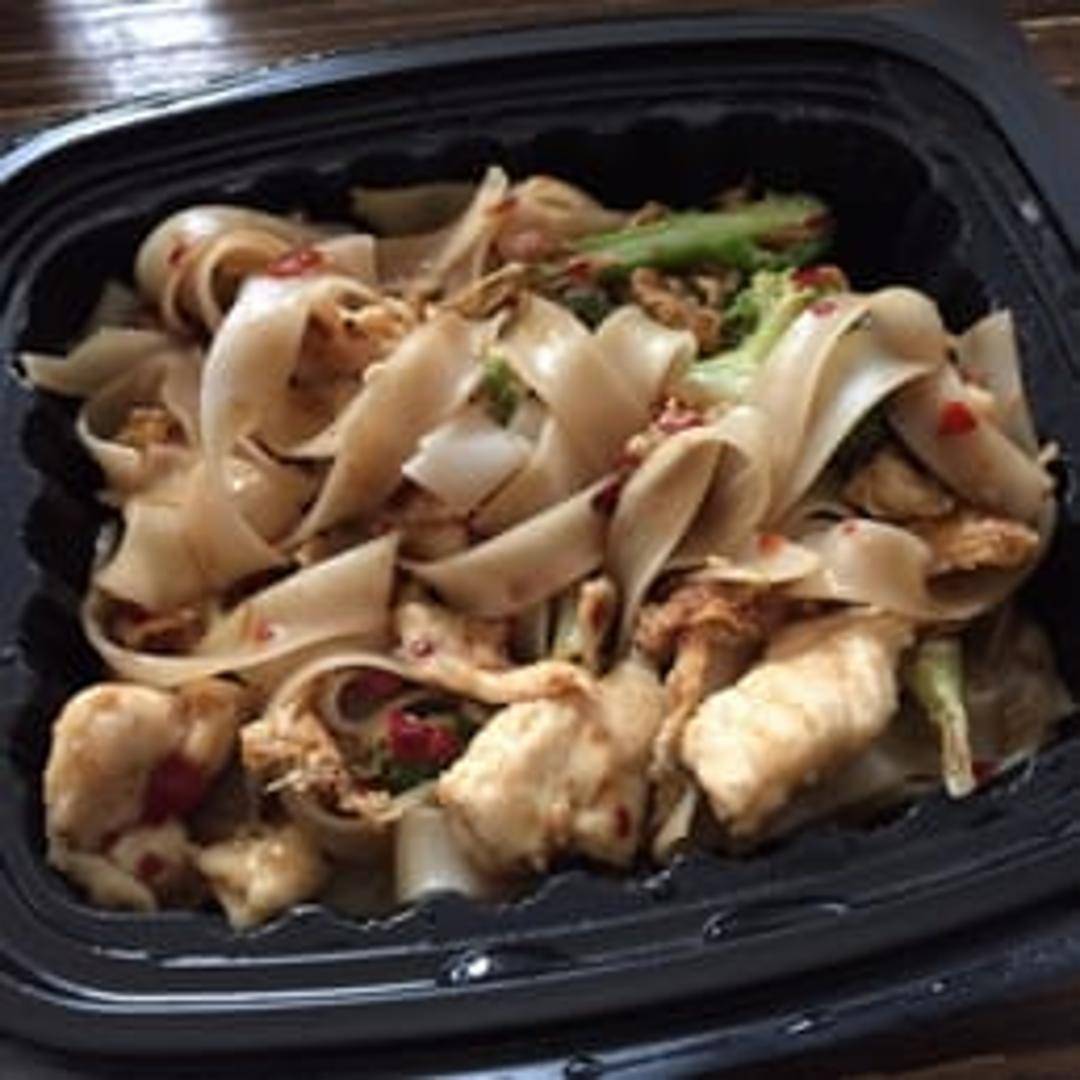 Wide rice noodles stir-fried with Chinese broccoli, egg, and your choice of protein in a savory sweet soy sauce based sauce.