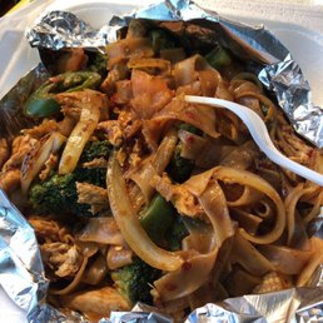 Stir-fried wide rice noodles with basil, bell peppers, onions, tomatoes, and chili in a savory and spicy sauce. Also known as Drunken Noodles.