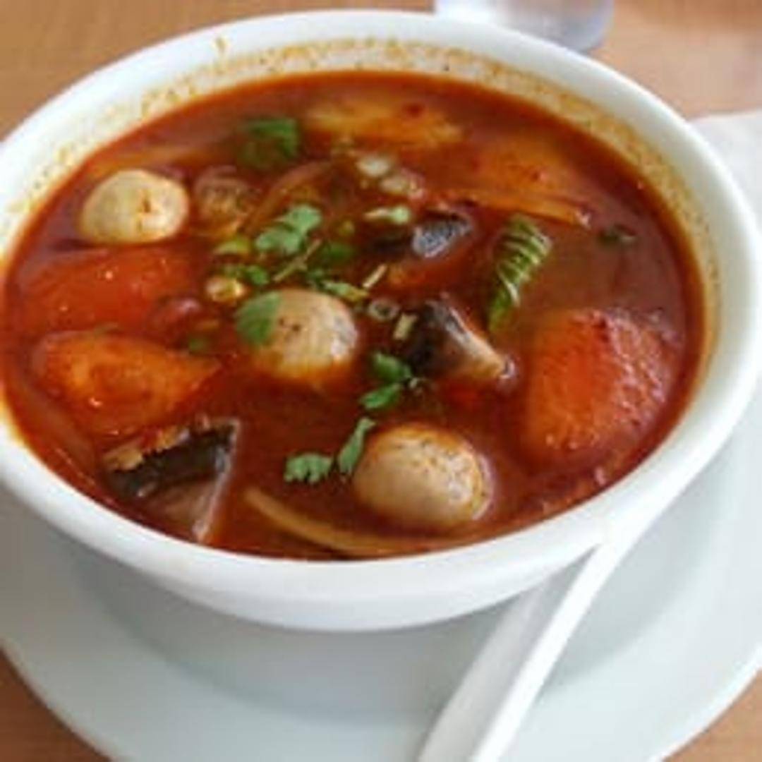 A hot and sour soup flavored with lemongrass, galangal, kaffir lime leaves, mushrooms, tomatoes, onions, and chili peppers. Your choice of protein enhances this classic Thai soup.