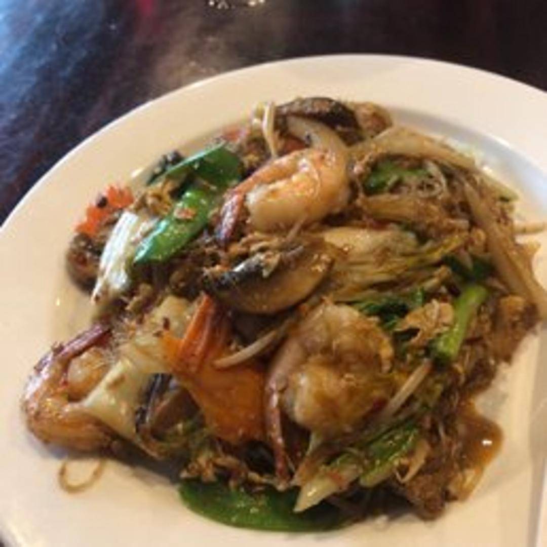 Stir-fried glass noodles with egg, vegetables (cabbage, carrots, bean sprouts), and your choice of protein (tofu, chicken, pork, beef, shrimp, or combination). Seasoned with soy sauce and other Thai spices.