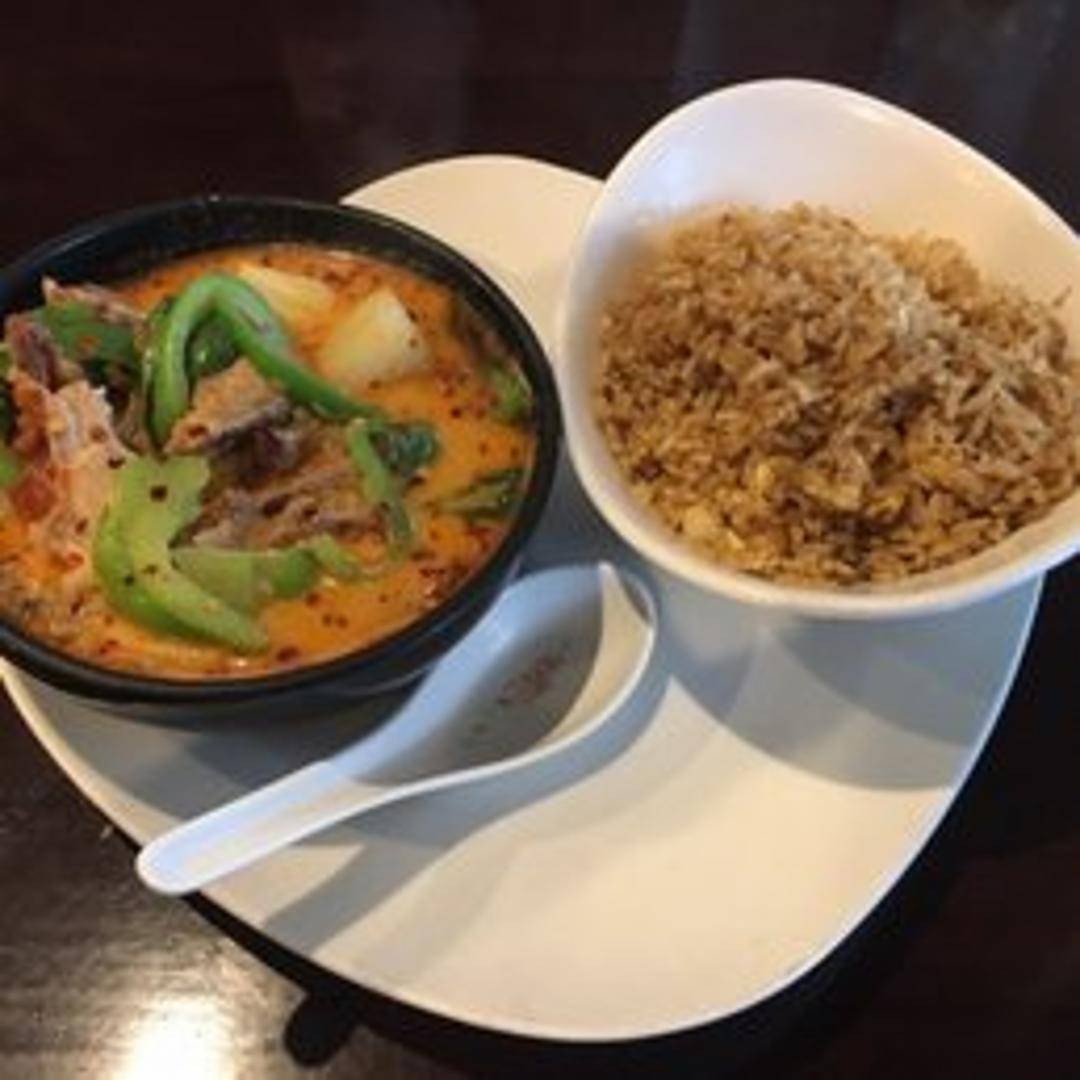 Tender roasted duck simmered in a rich red curry sauce with coconut milk, pineapple, tomatoes, bell peppers, and basil. Served with steamed rice.