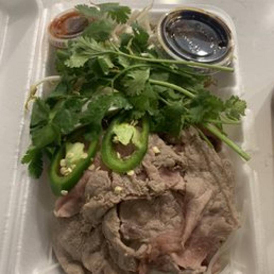 A hearty and aromatic bowl of spicy beef pho, featuring tender slices of slow-cooked beef and thin rice noodles steeped in a rich, savory broth. This flavorful soup is enhanced with a fiery kick and traditionally garnished with fresh herbs like cilantro and basil, along with crisp bean sprouts and a lime wedge for a burst of freshness.