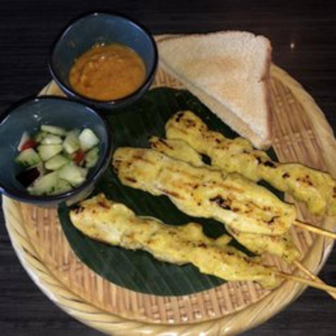 Grilled marinated chicken skewers served with a creamy peanut sauce and a refreshing cucumber relish.